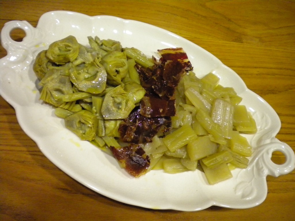 Como alcachofa( Cynara Scolymus) conocemos la cabezuela, de tamaño similar a una pelota de tenis alargada, que está recubierta de unas hojuelas, que se llaman brácteas. Las parte comestibles son el corazon y el fondo, para lo que es preciso retirar y cortar las puntas de las brácteas sin piedad, el maestro Busca Isusi decía, “hay que hacerlo olvidándonos,del precio que hemos pagado por ellas”, así, todo lo que llevemos a la boca será comestible. Se oxidan y ennegrecen con facilidad, por ello, hay quienes aconsejan untarlas con limón antes de cocerlas, pero para mi gusto, el cítrico desvirtúa el genuino sabor de la verdura. Una vez cocidas las dos hortalizas, se echan en un recipiente con aceite caliente se espolvorean con almendra molida y riegan con un poco de agua de la cocción, removiendo un poco para que se forme una especie de bechamel ligera.